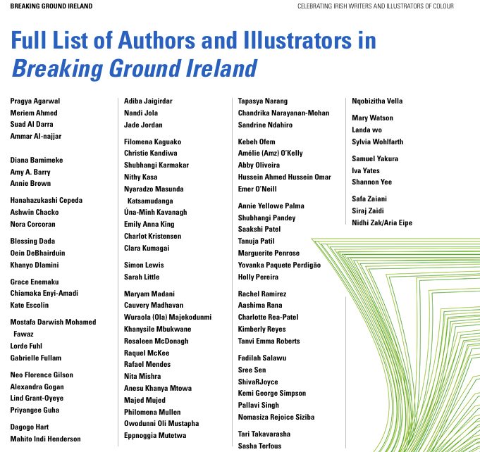 In an article written for Writer’s Mosaic, Katrina Goldstone has described Breaking Ground Ireland as ‘a small publication […with] an historic significance. [… and] the potential to represent a seismic cultural shift, if widely disseminated and properly used and consulted by programmers, academics, and the publishing industry’. The pamphlet to which she refers, freely available both in hard copy and online, is the first publication of its kind in Ireland. Formally launched at Cúirt International Festival of Literature in 2022, this publication profiles 90 writers and illustrators from ethnic minority backgrounds who are currently enriching the Irish literary landscape.
