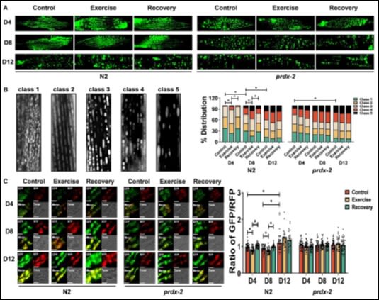 Image (below): Example of mitochondrial fragmentation and disrupted mitophagy using a myo-3::gfp reporter (mitochondria) and myo-3-p::tomm20::Rosella reporter