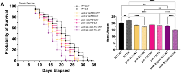Image (Below): Example lifespan assay for different C. elegans single and double mutant strains following exercise intervention.