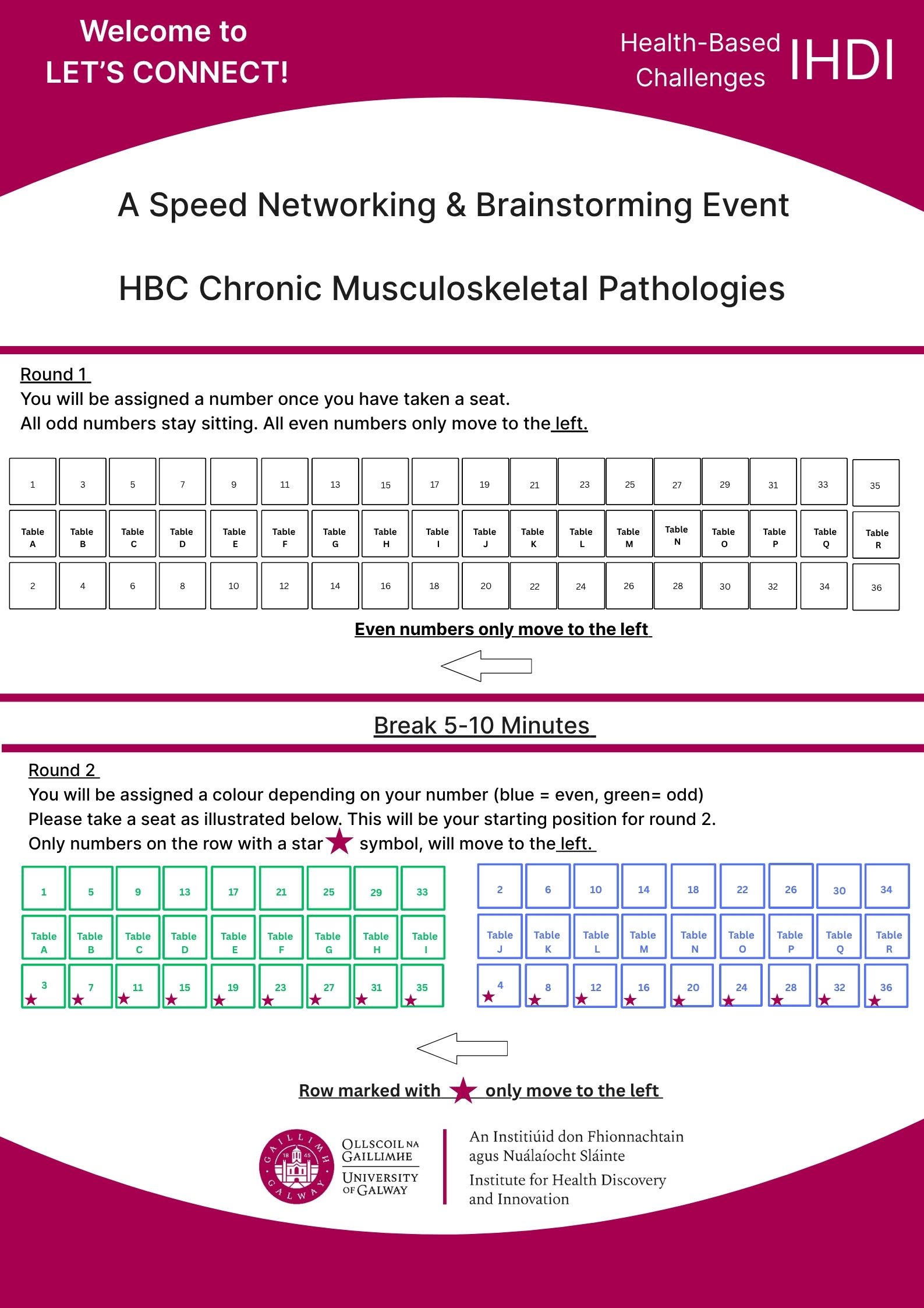 You will be assigned a colour depending on your number ( blue= even, green = odd). Please take a seat according to the seating chart available onsite on the day. This will be your starting position for round 2. Only numbers that have a star symbol next to them will move to the left. If you do not have a star your number badge, you will remain seated for round 2 .You will have approx. 90 seconds per interaction. Details can be tracked on the interaction tracker sheet.