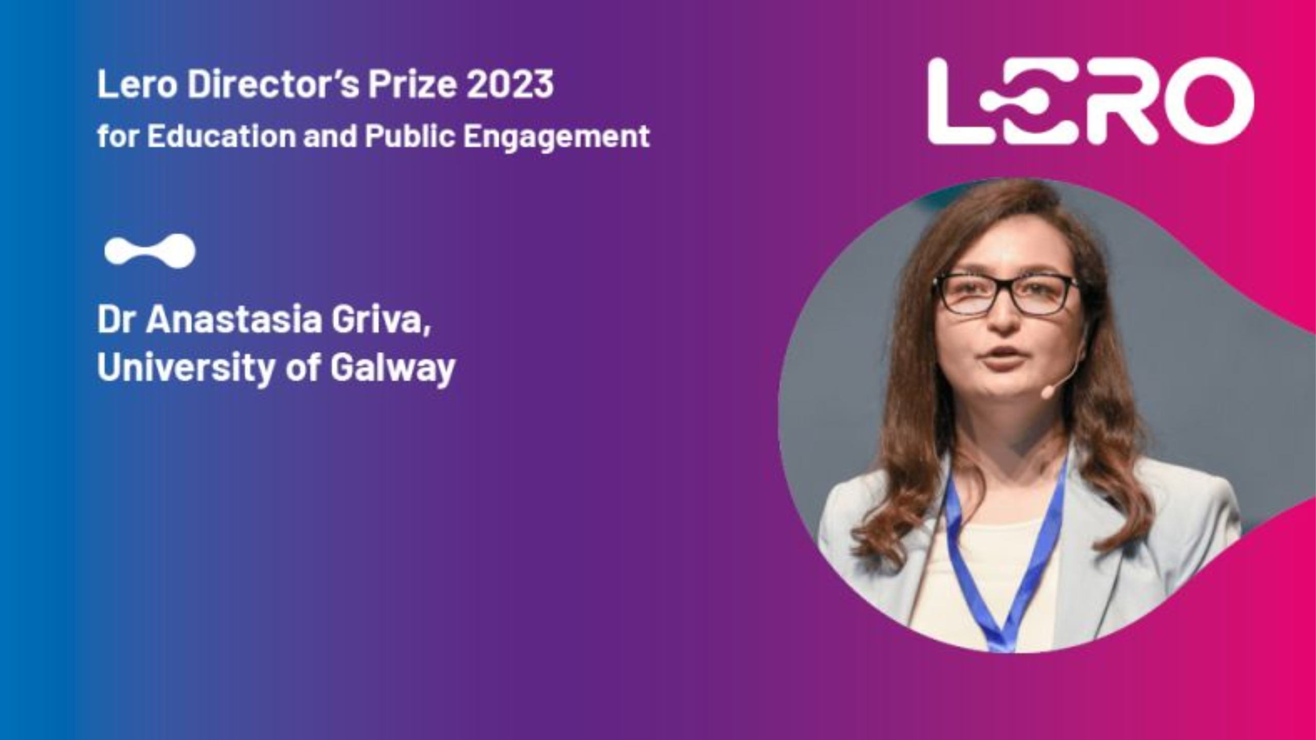 Dr Griva recieved the Lero Director's Prize for Education and Public Engagement 2023, in recognition of her contribution in the areas of education and public engagement on behalf of J.E. Cairnes School of Business and Economics.